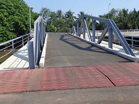 Phần cầu dẫn cơ động bằng sắt (lên xuống theo con nước) rộng 8,4 mét cũng đã được xây lắp, kết nối xong với phần cầu dẫn cố định và phao nổi dưới nước.
