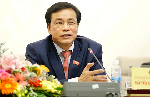 Ông Nguyễn Hạnh Phúc, Tổng Thư ký Quốc hội, Chủ nhiệm Văn phòng Quốc hội, trả lời các câu hỏi tại cuộc họp báo. Ảnh: AN ĐĂNG