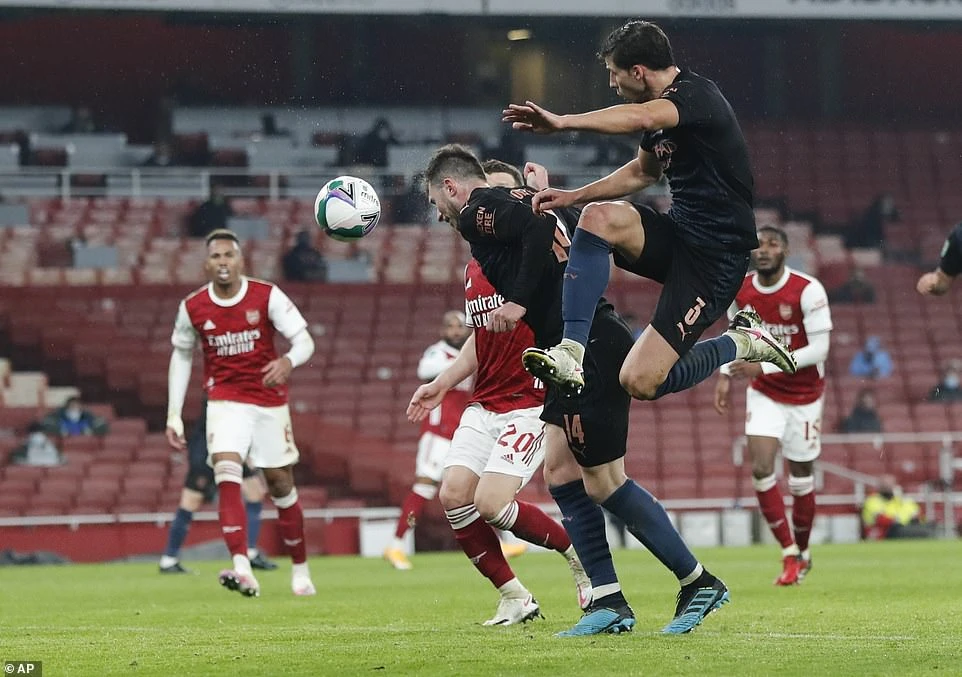 Phải đến phút 31, Arsenal mới đưa trận đấu về vạch xuất phát nhờ pha đánh đầu của Lacazette. Ảnh: AP.