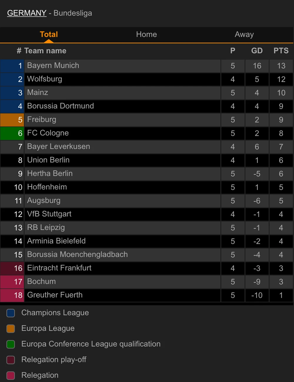 Giành chiến thắng với tỷ số 7-0 trước Bochum, Bayern Munich tạm chiếm ngôi đầu bảng với 13 điểm sau 5 vòng đấu, xếp sau Bayern là Wolfsburg với 12 điểm nhưng thi đấu ít hơn 1 trận. Tại vòng 5 Bundesliga, Wolfsburg sẽ tiếp đón Eintracht Frankfurt trên sân nhà Volkswagen.