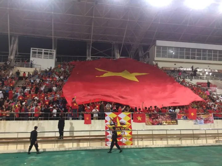 Các CĐV mang đại kỳ Việt Nam vào sân vận động quốc gia Lào. Ảnh: NGỌC DUNG