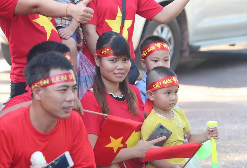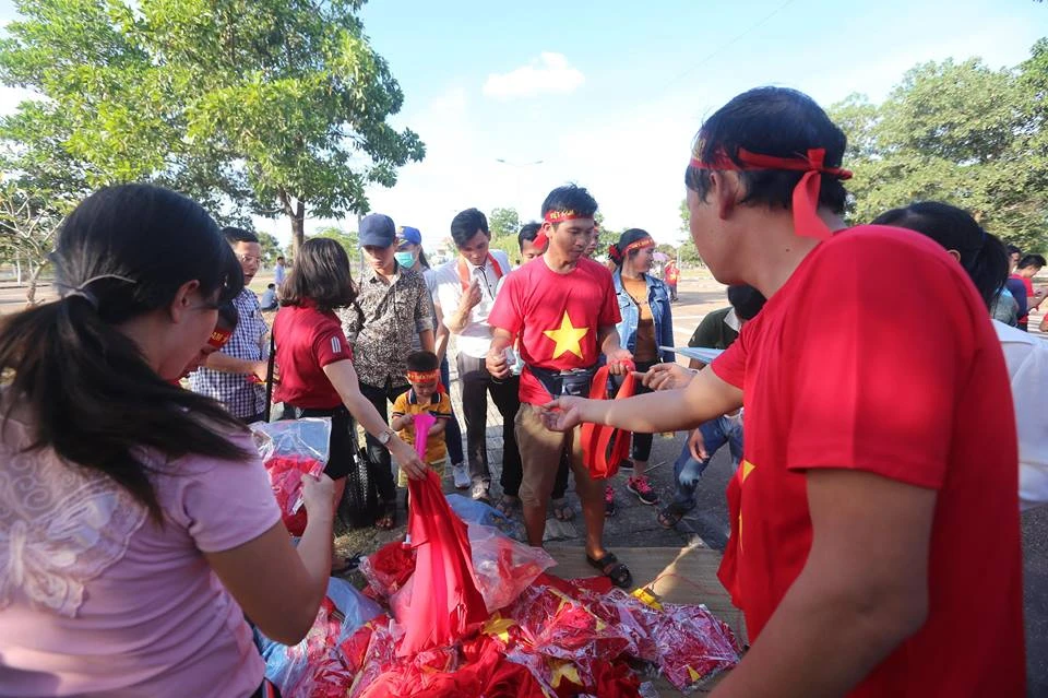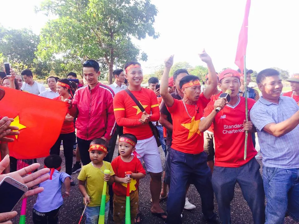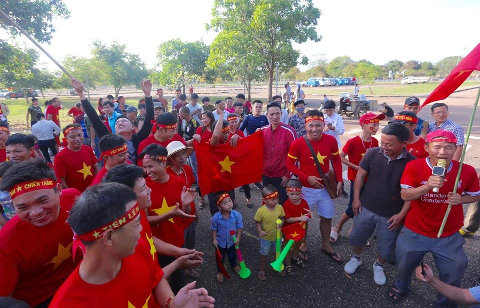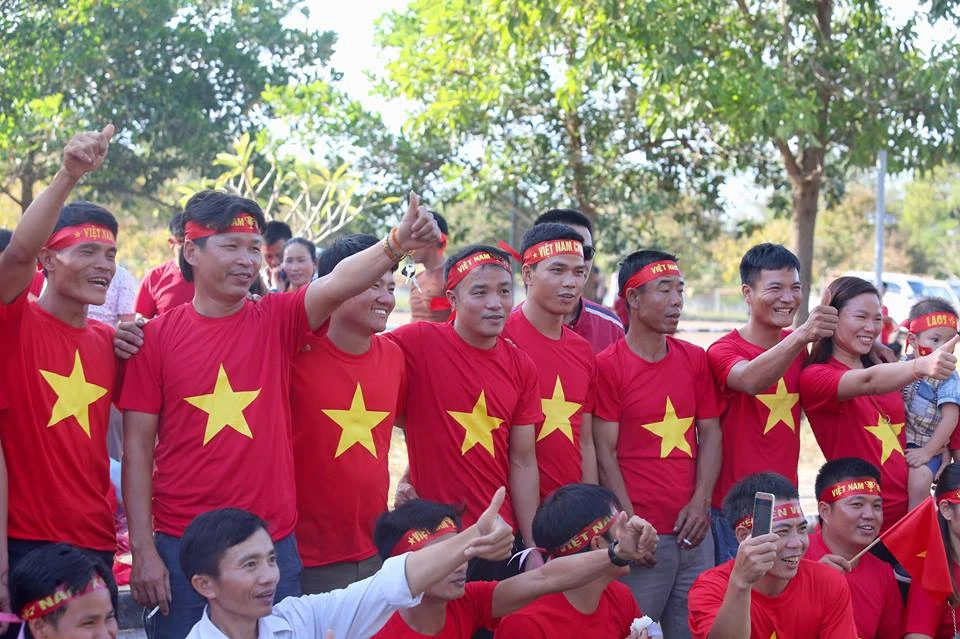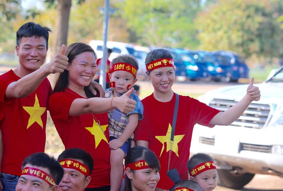 CĐV Việt Nam nhuộm đỏ bên ngoài sân vận động quốc gia Lào. Ảnh: NGỌC DUNG