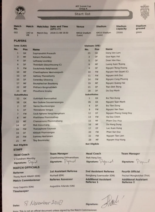 Ở trận mở màn AFF Cup 2018, đội tuyển Việt Nam ra sân với trang phục toàn trắng, chủ nhà Lào ra sân với trang phục toàn đỏ. Hai đội đang bước ra sân làm thủ tục trước trận đấu.