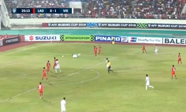 Quá nửa thời gian thi đấu của hiệp 1 đã trôi qua, đội tuyển Việt Nam đang chơi bên nửa phần sân đội tuyển Lào và ép sân toàn diện.