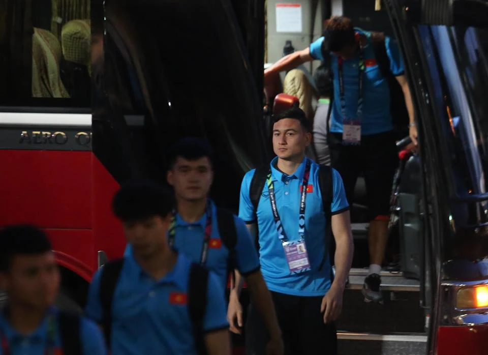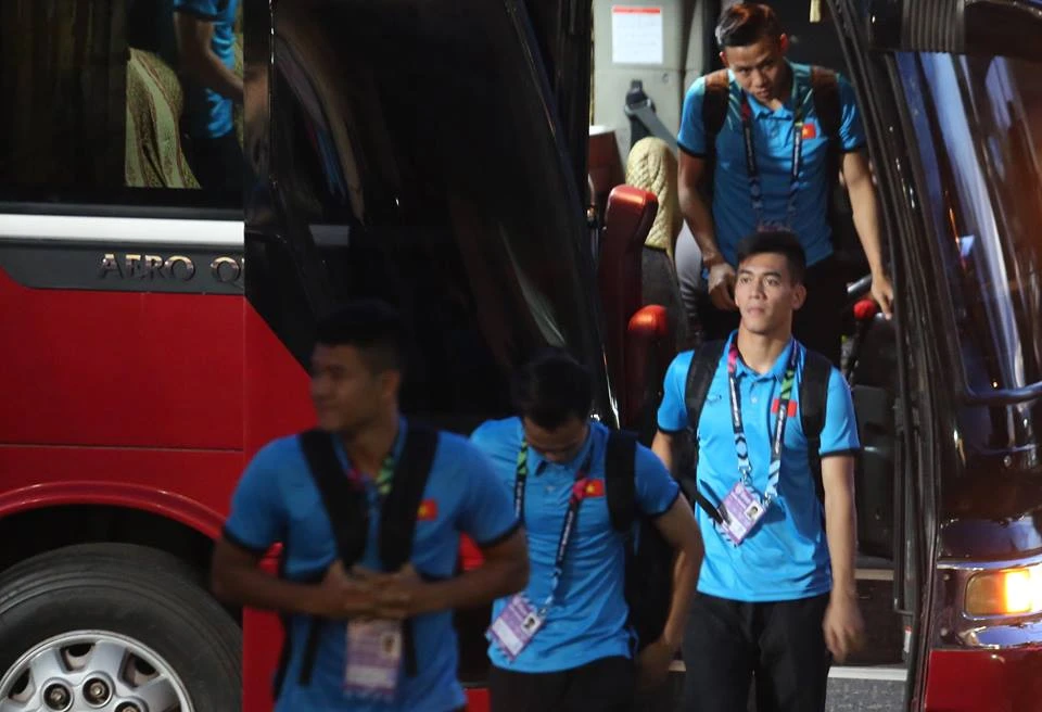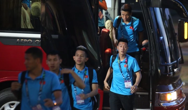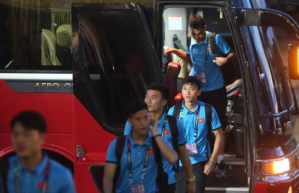 HLV Park Hang-seo và các cầu thủ đội tuyển Việt Nam bước xuống xe buýt vào sân. Ảnh: NGỌC DUNG
