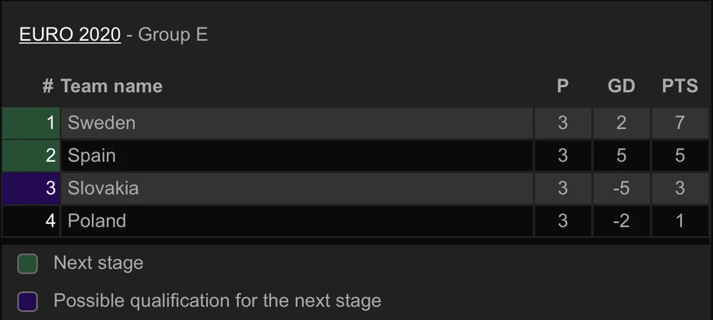 Ở trận đấu cùng giờ bảng E, Thụy Điển có chiến thắng rượt đuổi trước Ba Lan với tỷ số 3-2 để chiếm ngôi đầu bảng với 7 điểm. Kết thúc vòng bảng Euro 2020, Slovakia dù đứng thứ 3 bảng E với với 3 điểm, nhưng việc hiệu số của đội bóng này lên đến -5 khiến Slovakia chắc chắn chia tay Euro.