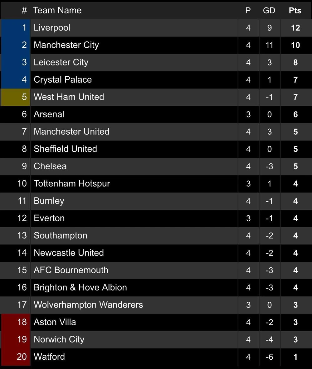 BXH Premier League