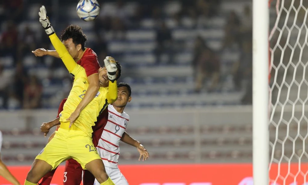 Không vào!!!!!!!!!!! Phút 90+5, thủ môn Văn Toản đã thi đấu xuất sắc, đổ người đúng hướng đẩy bóng cứu thua sau cú sút của Keo Sokpheng.