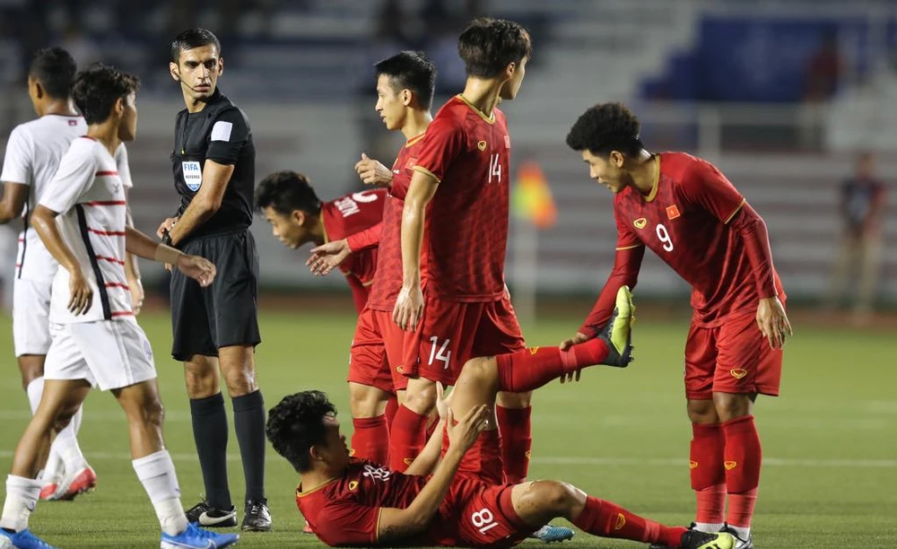 Phút 34, Hùng Dũng, Thành Chung và Tiến Linh thay phiên nhau nằm sân đau đớn sau những pha va chạm với cầu thủ Campuchia.