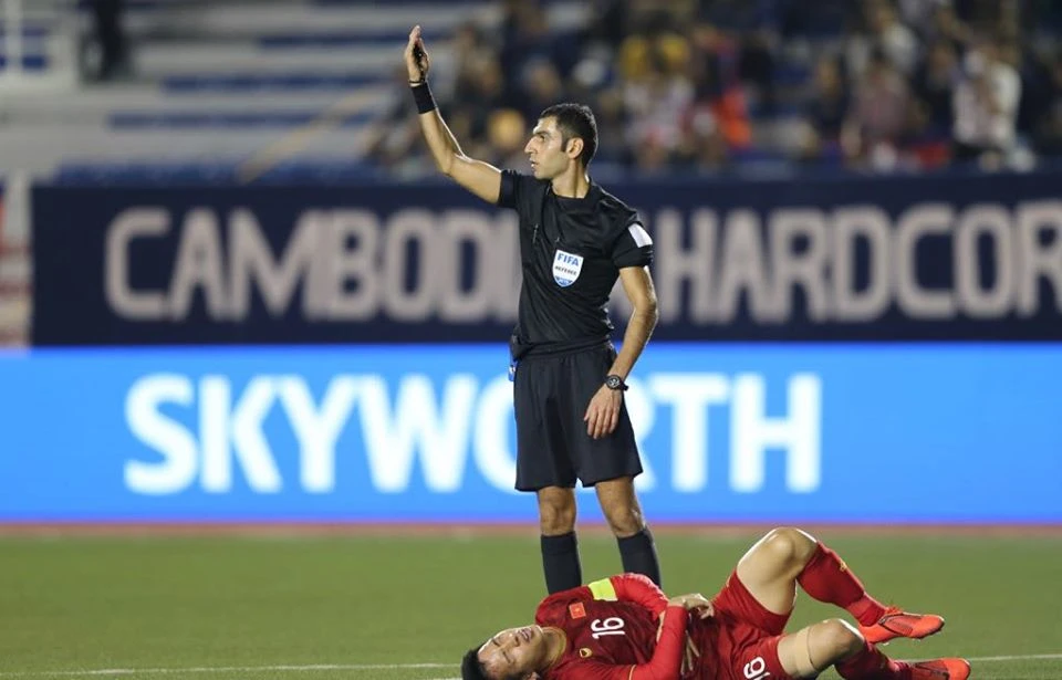 Phút 17, Mao Piseth lao thẳng cả hai chân vào Trọng Hoàng và phải nhận thẻ vàng. HLV Park Hang-seo phản ứng trong tình huống này cũng phải nhận thẻ vàng.
