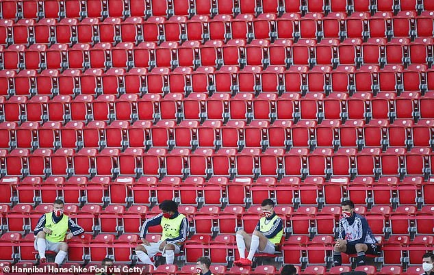 Để phòng ngừa dịch COVID-19, các cầu thủ trên ghế dự bị phải đeo khẩu trang và giữ khoảng cách với nhau.