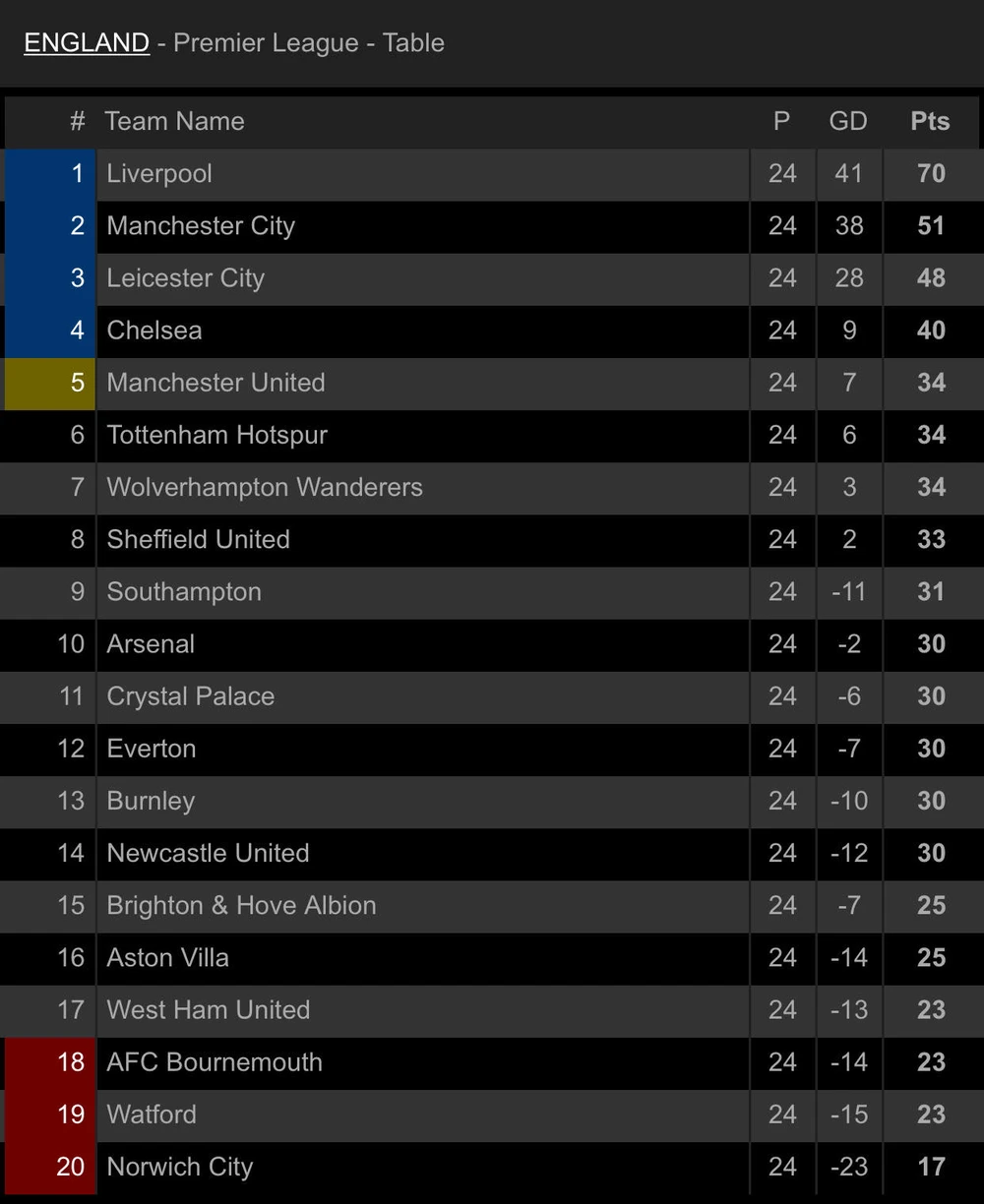 Giành chiến thắng với tỉ số 2-0 tại London Stadium, Liverpool tiếp tục duy trì ngôi đầu với 70 điểm sau 24 trận bất bại. Vị trí số một của Liverpool hiện tại ở đấu trường Premier League mùa này rất khó có đội nào “lật” được, bởi khoảng cách giữa Liverpool và đội nhì bảng là Man. City lên đến tận 19 điểm.