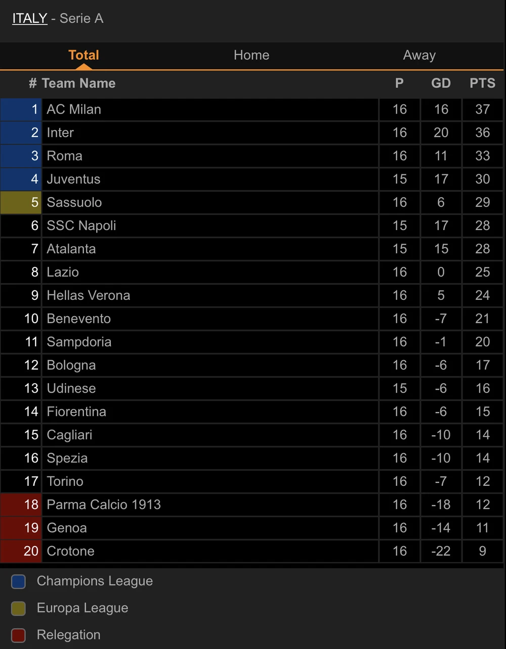 Với kết quả này, Juventus có được vị trí thứ tư trên BXH với 30 điểm, nhưng thi đấu ít hơn các đội bóng khác một trận. Còn AC Milan mặc dù nhận trận thua, nhưng ngôi đầu vẫn nằm trong tay thầy trò Stefano Pioli khi có được 37 điểm, hơn đội xếp sau là Inter Milan 1 điểm.