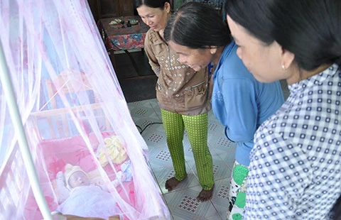 Bé Huy vẫn say giấc khi hàng xóm đến thăm . Ảnh: D.TÍNH