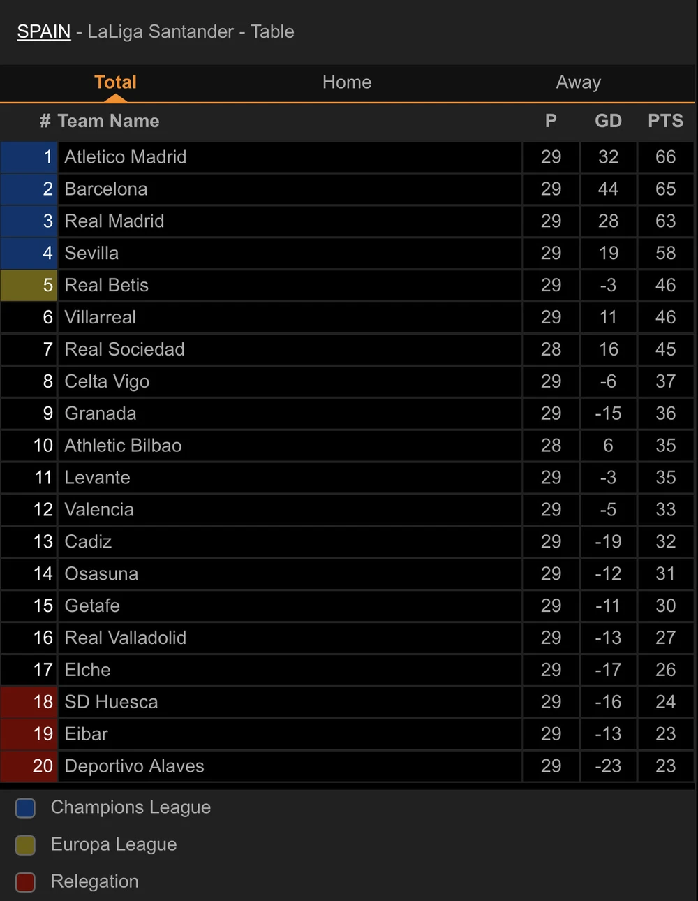 Sau vòng 29 cuộc đua lên ngôi vô địch La Liga càng thêm hấp dẫn. Atletico Madrid dù vẫn đứng đầu bảng với 66 điểm, nhưng khoảng cách an toàn của thầy trò Simeone đã không còn. Bởi tại vòng đấu này Atletico Madrid để thua trên sân của Sevilla 0-1, còn Barcelona với chiến thắng tối thiểu trên sân nhà đã lấy lại vị trí thứ hai và bám sát Atletico Madrid với 65 điểm. Trong khi đó ĐKVĐ Real Madrid đứng vị trí thứ ba với 63 điểm.