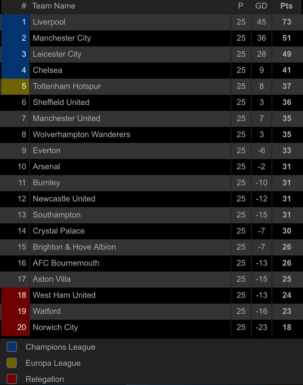 Thua Tottenham với tỉ số 0-2, Man. City gần như không còn cơ hội để bảo vệ ngôi vô địch Premier League, sau 25 vòng đấu Man. City có được 51 điểm, kém đội đầu bảng Liverpool 22 điểm. Ngược lại về phía Tottenham sau chiến thắng này, thầy trò HLV Mourinho vươn lên vị trí thứ 5 với 37 điểm kém đội hạng tư là Chelsea 4 điểm.