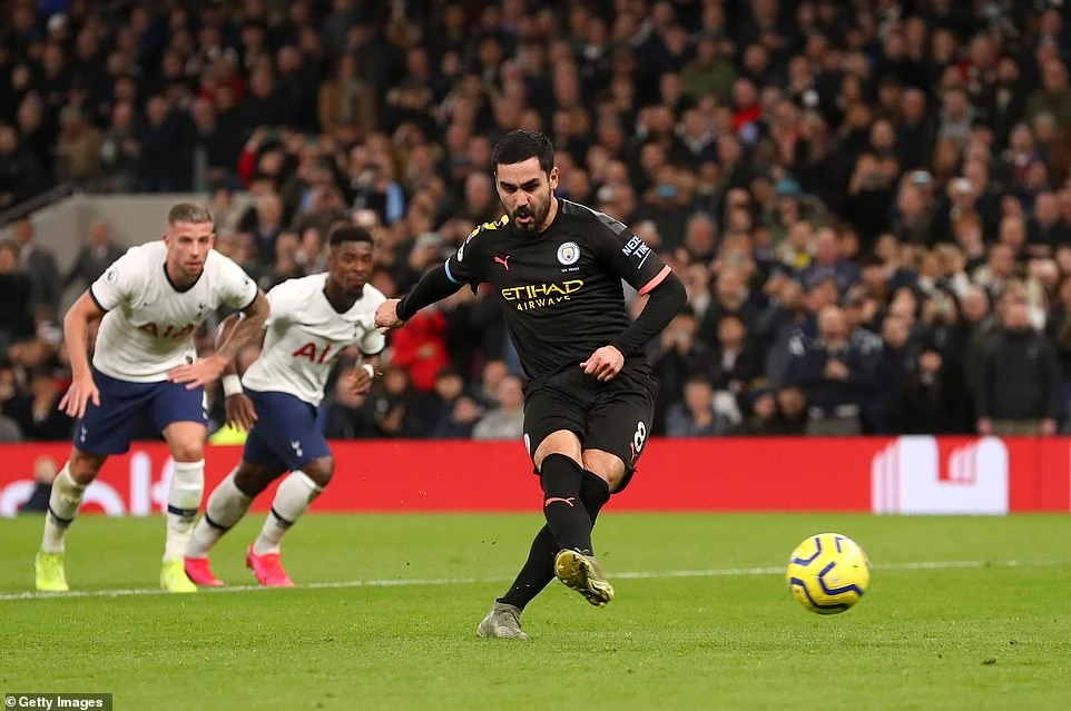 Điểm nhấn của hiệp 1 trận đại chiến là tình huống Man. City được hưởng phạt đền khi trung phong Aguero ngã trong vòng cấm ở phút 39. Tuy nhiên, trên chấm 11 m, tiền vệ Gundogan lại không thể đánh bại được thủ môn Hugo Lloris. Hàng công thi nhau bắn phá khung thành đối phương nhưng gặp phải lối chơi chắc chắn cùng với màn trình diễn xuất sắc của thủ môn Hugo Lloris bên phía Tottenham, vì thế Man. City đành chấp nhận kết thúc hiệp 1 với tỉ số hòa không bàn thắng.
