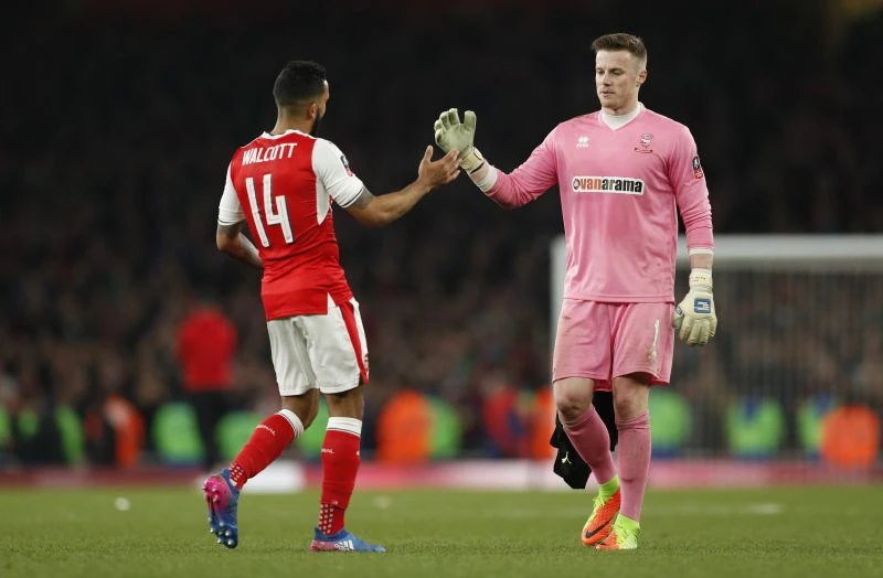 Theo Walcott bắt tay thủ môn Farman của Lincoln sau trận đấu.