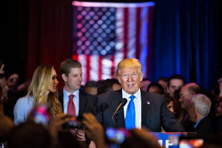 Ông Trump phát biểu mừng chiến thắng ngày 26-4. Ảnh: NYT