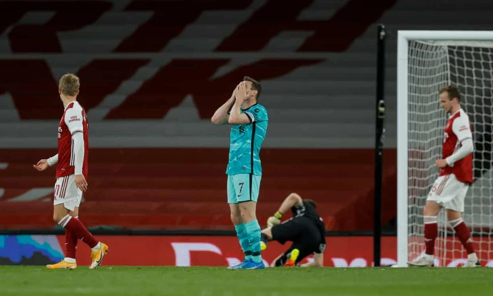 Đến phút 35, James Milner thoải mái dứt điểm trong vòng cấm sau đường căng ngang của Arnold, tuy nhiên bóng lại tiếp tục đi chệch cột dọc của “pháo thủ”.