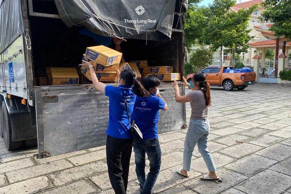 Cán bộ, nhân viên công ty Thang Long Real vận chuyển mì đến UBND phường Trường Thạnh (TP Thủ Đức).
