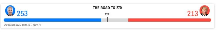 Hiện tại, ông Biden dẫn đầu cuộc đua với 253 phiếu đại cử tri so với 213 phiếu đại cử tri của ông Trump.