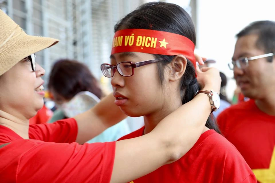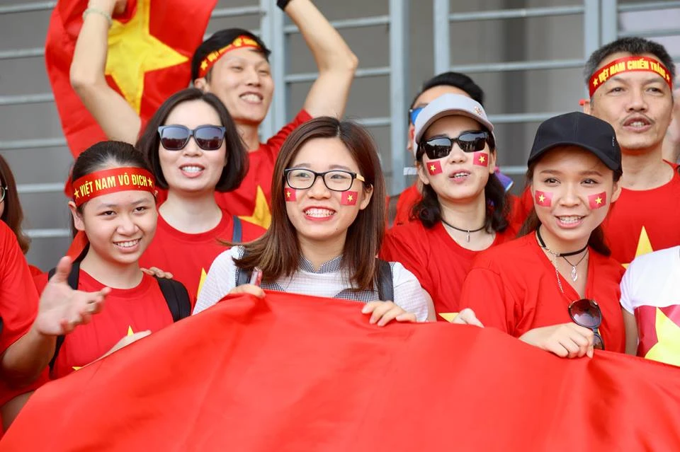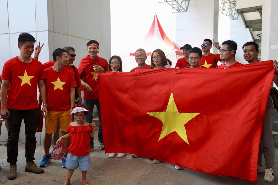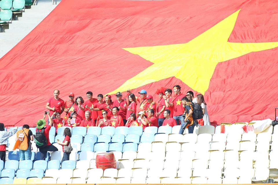 CĐV với cờ đỏ sao vàng ngợp trời đến sân cổ vũ cho Olympic Việt Nam.