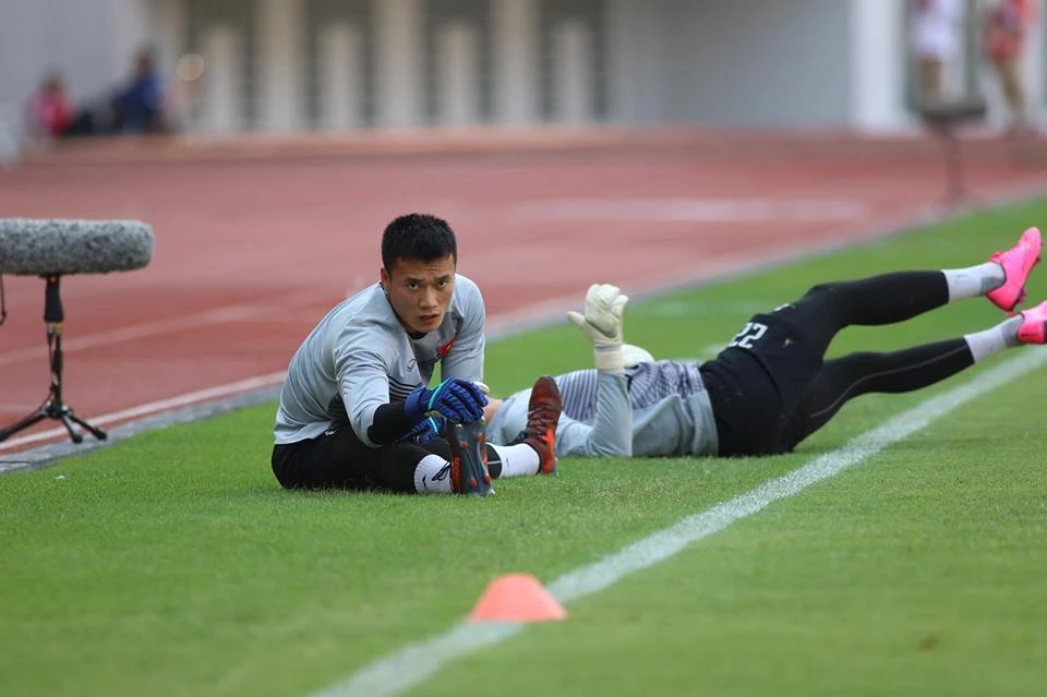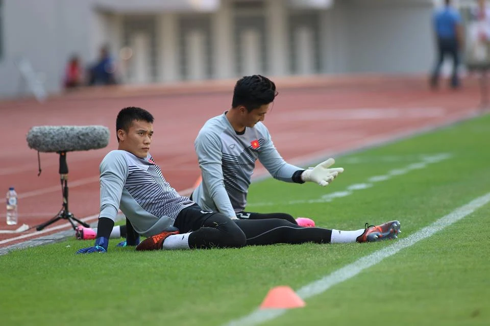 Hai thủ môn của Olympic Việt Nam, Tiến Dũng và Văn Hoàng khởi động trước trận đấu.