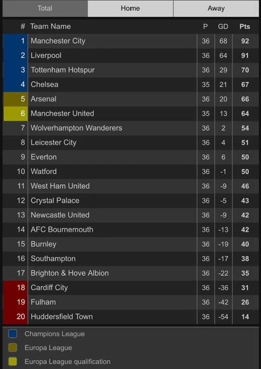 Thắng Burnley 1-0, Man. City với đạt mục tiêu đòi lại ngôi đầu bảng từ tay Liverpool. Sau 36 vòng đấu, Man. City có được 92 điểm hơn đối thủ cạnh tranh Liverpool 1 điểm.