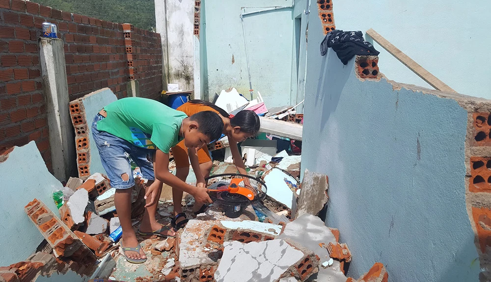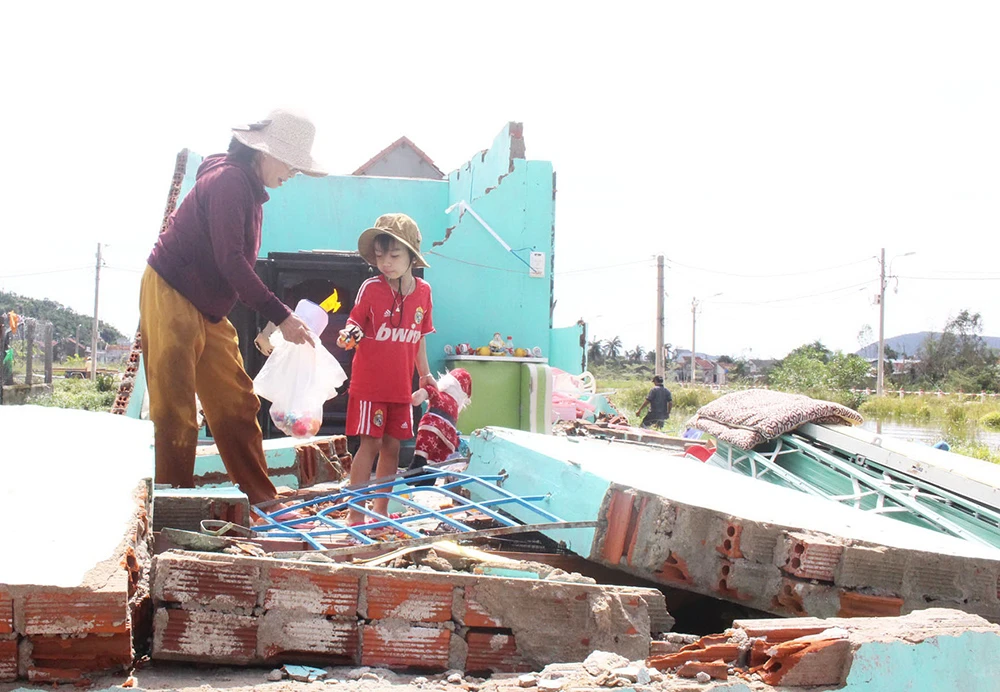 Bà Võ Thị Như Mai (60 tuổi, ngụ thôn Tây Bắc, xã Đại Lãnh, huyện Vạn Ninh) cùng cháu nhặt nhạnh những gì còn lại của ngôi nhà bị sập. Ảnh: TẤN LỘC