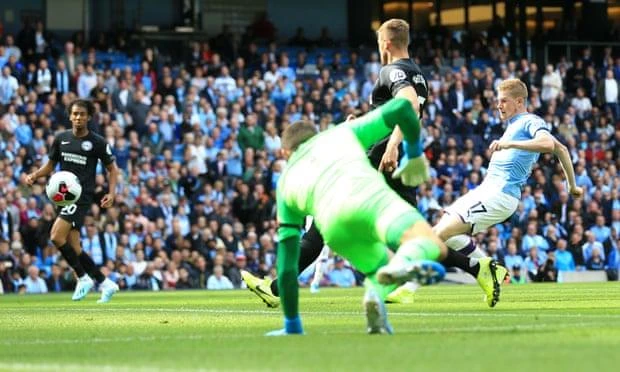 Với đội hình mạnh và mong muốn tạm chiếm ngôi đầu để gây áp lực lên Liverpool, ngay phút 2 chủ nhà Man. City đã đạt được mục tiêu có được bàn thắng sớm nhờ công của Kevin De Bruyne. Từ đường chuyền thẳng vào vòng cấm của Birghton, David Silva nhanh chân căng ngang để tiền vệ người Bỉ dễ dàng dứt điểm cận thành mở tỷ số 1-0.