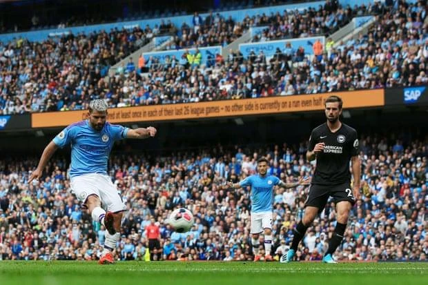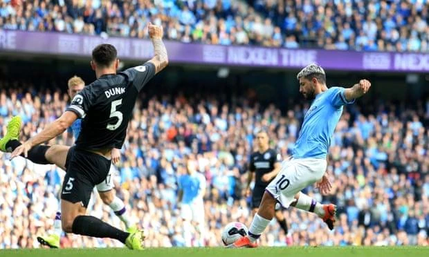 Các chân sút của Man. City là Sterling, Mahrez và Aguero thi nhau dứt điểm gây chao đảo khung thành của Brighton, thế nhưng phải đến những phút cuối hiệp một đoàn quân của HLV Pep Guardiola mới có được bàn thắng thứ hai. Phút 43 sau tình huống lên bóng tốc độ và phối hợp nhịp nhàng của các cầu thủ Man. City, Aguero dễ dàng dứt điểm đưa bóng vào góc cao khung thành nâng tỷ số lên 2-0.