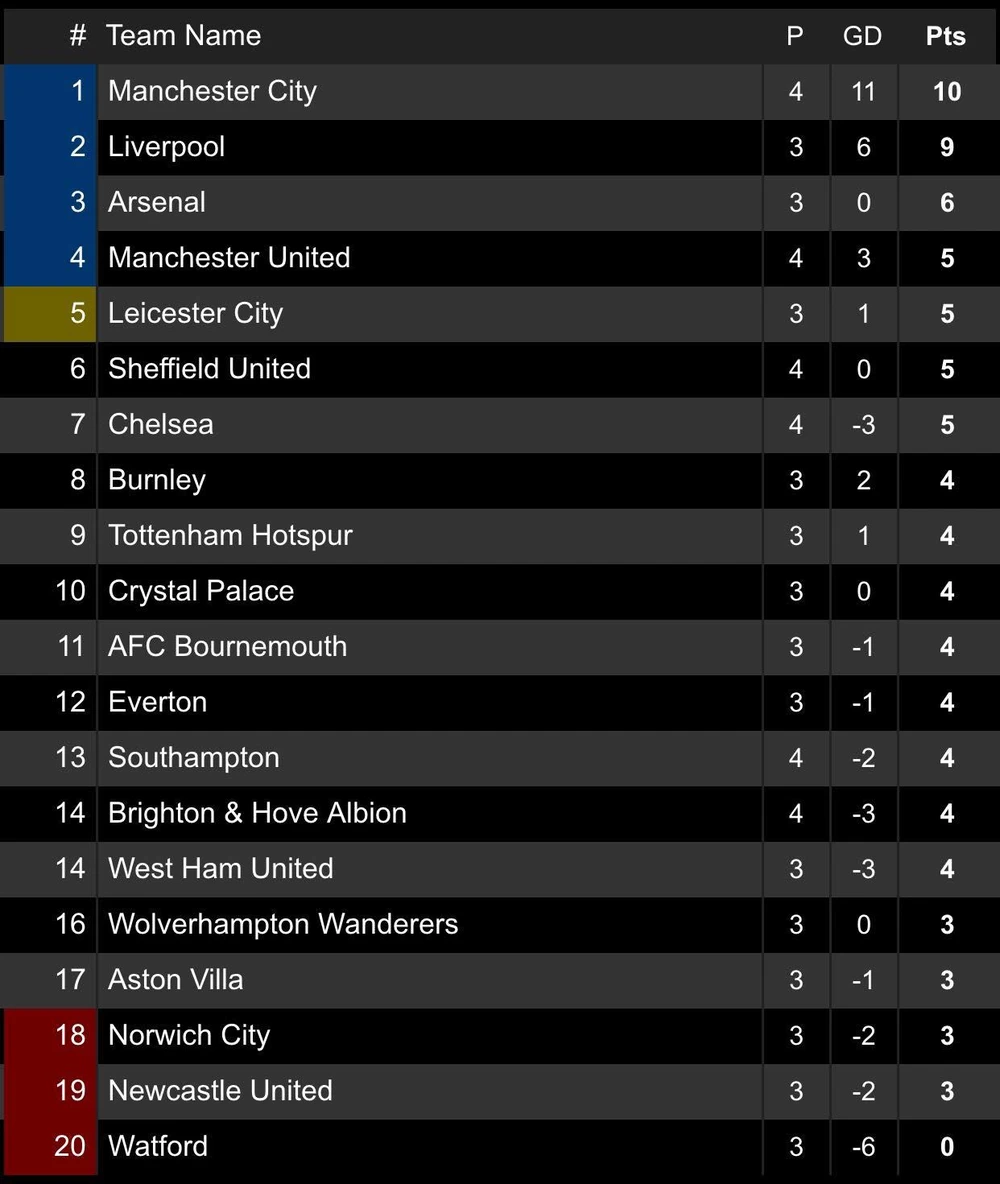 Thi đấu sớm hơn Liverpool và giành chiến thắng tưng bừng 4-0 trên sân nhà Etihad trước đối thủ Brighton, Man. City tạm chiếm vị trí đầu bảng với 10 điểm sau 4 vòng đấu. Tuy nhiên ngôi đầu của Premier League khó nằm trong tay của HLV Pep Guardiola và học trò bởi ở vòng 4 Premier League, Liverpool có chuyến làm khách đến chơi trên sân của Burnley.