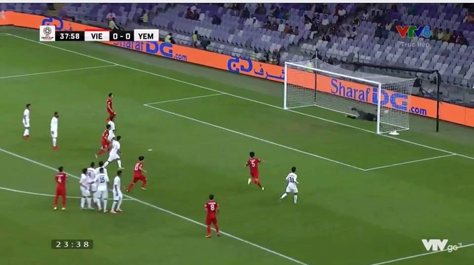 Phút 42, Việt Nam tạo được tình huống lộn xộn trước khung thành Yemen, kết thúc bằng cú sút từ xa vọt xà của Xuân Trường.