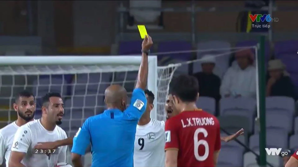 Phút 36, Mudir Abdurabu khi phản đối trọng tài vì một tình huống cầu thủ Yemen phạm lỗi với Công Phượng ngay trước vòng cấm.
