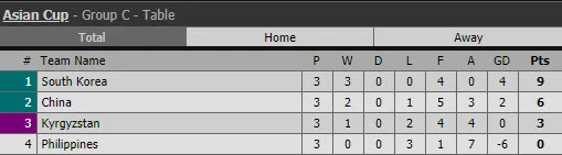Ở lượt trận cuối bảng C vừa kết thúc, Hàn Quốc thắng Trung Quốc 2-0, trong khi Philippines thất bại 1-3 trước Kyrgyzstan. Với kết quả này, Hàn Quốc (9 điểm) và Trung Quốc (6 điểm) đi tiếp.