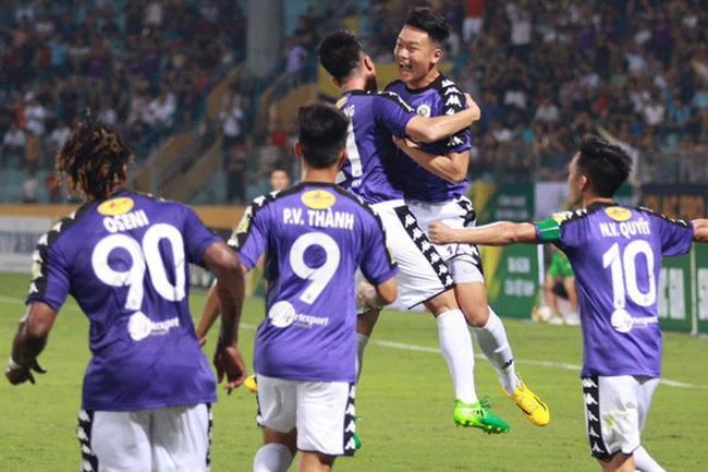 Đình Trọng và Thành Chung ăn mừng bàn thắng trong màu áo CLB Hà Nội