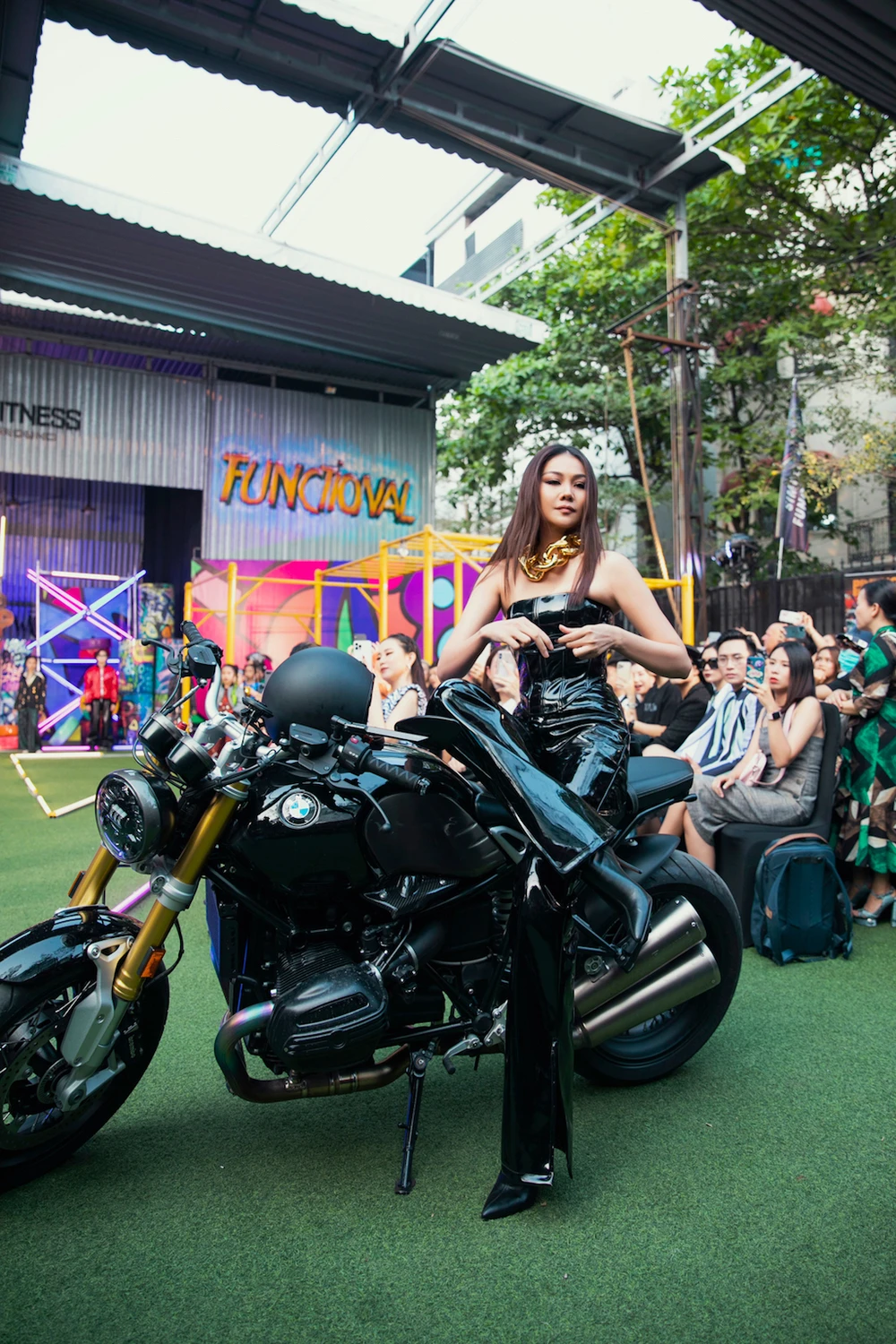Siêu mẫu Thanh Hằng tạo dáng bên motor trước khi lái motor vào sàn runway với trang phục cực ngầu của nhà thiết kế Hà Nhật Tiến. Ảnh: Kiếng Cận team