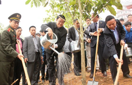 Trong dịp đến thăm Thanh Hóa, Chủ tịch nước Trương Tấn Sang đã phát động tết trồng cây tại Đền thờ bà mẹ Việt Nam anh hùng (Hàm Rồng, Thanh Hóa). Ảnh: Đ.TRUNG