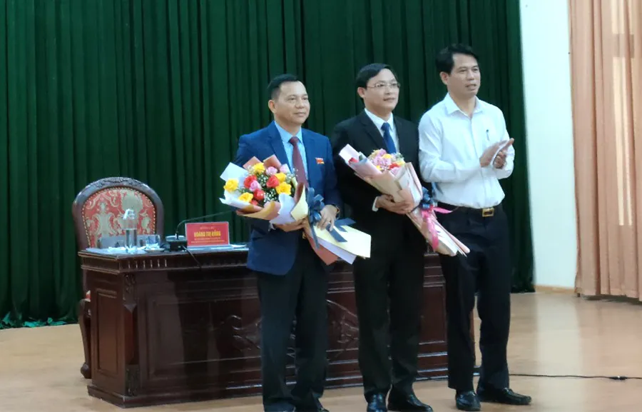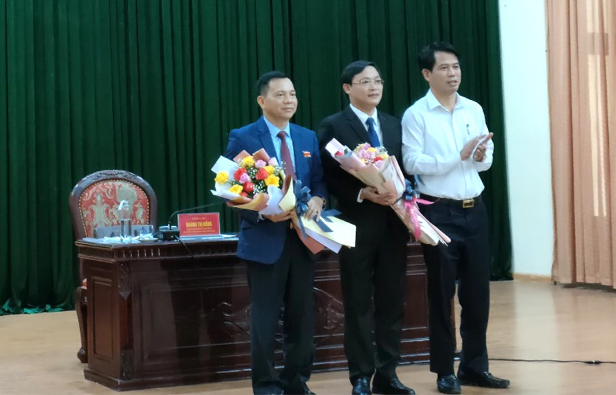 Trưởng Ban Tuyên giáo Tỉnh ủy Thanh Hóa ông Đào Xuân Yên (áo trắng) tặng hoa chúc mừng tân Chủ tịch UBND huyện Lang Chánh ông Hoàng Văn Thanh (giữa) và ông Nguyễn Xuân Hồng - Chủ tịch HĐND huyện Lang Chánh. Ảnh: Đ. TRUNG