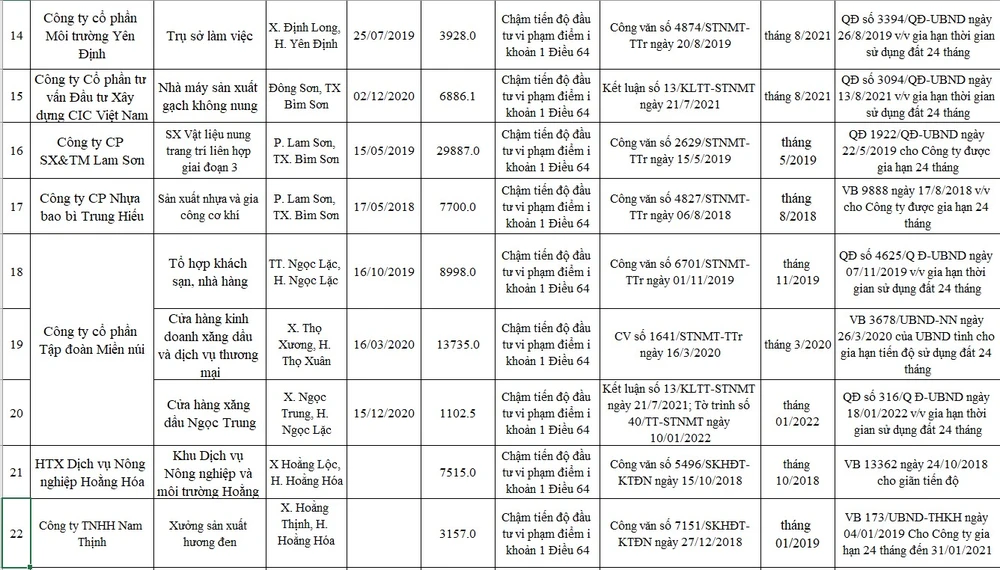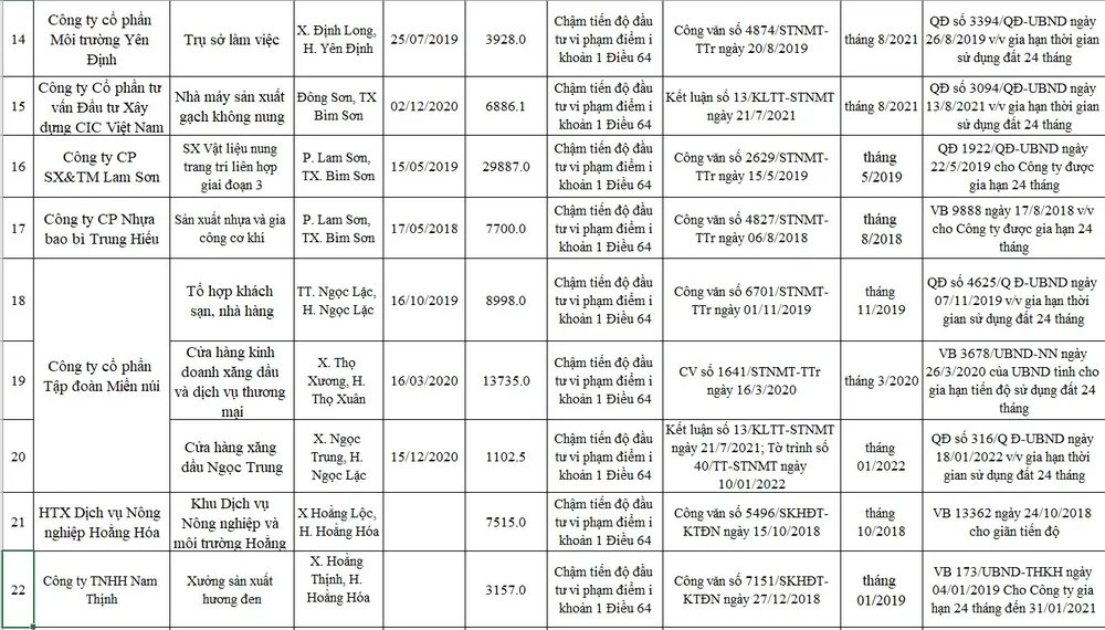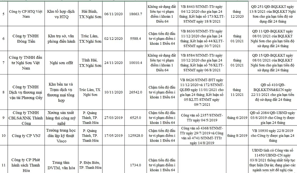 Trong trường hợp các dự án không thực hiện theo quy định kể từ ngày gia hạn Sở TN&MT cũng đề nghị UBND tỉnh Thanh Hóa xem xét chỉ đạo thu hồi đất, gia hạn tiến độ thực hiện đối với dự án đầu tư.