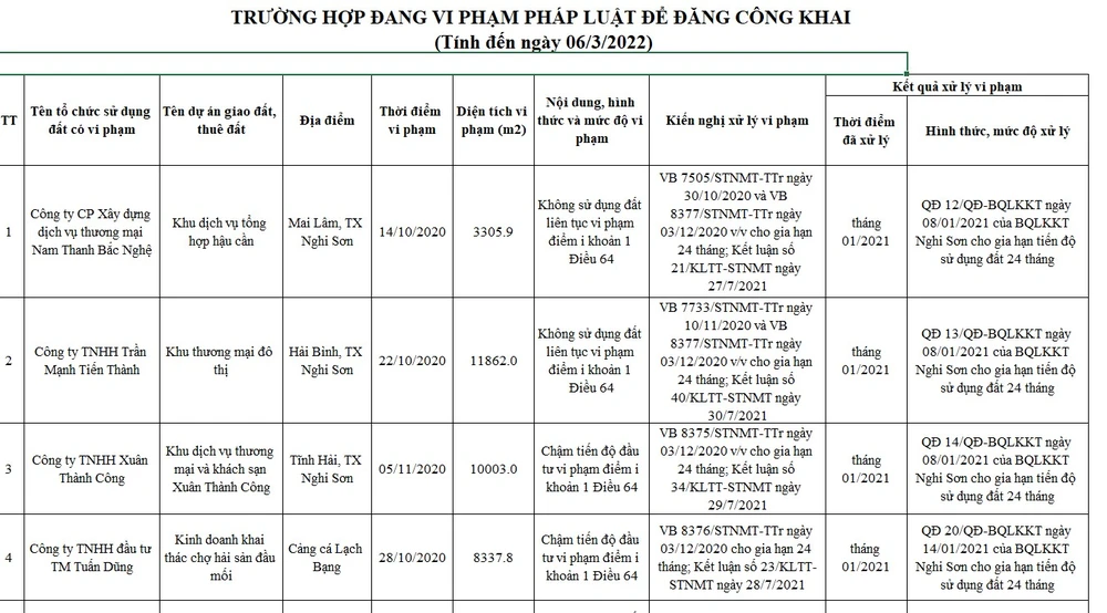 Theo công văn, ngày 1-12-2021, Văn phòng UBND tỉnh Thanh Hóa cập nhật danh sách 46 trường hợp đăng công khai vi phạm pháp luật đất đai đã khắc phục xong vi phạm trên trang thông tin điện tử của UBND tỉnh Thanh Hóa và Bộ TN&MT.