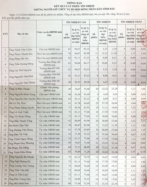 Chiều nay (12-12), HĐND tỉnh Thanh Hóa đã chính thức công bố kết quả lấy phiếu tín nhiệm đối với 29 chức danh được HĐND tỉnh khóa XVII, nhiệm kỳ 2016-2021. Theo đó, tỉnh lấy phiếu tín nhiệm ở ba mức: tín nhiệm cao, tín nhiệm và tín nhiệm thấp, tổng số phiếu phát ra là 90 phiếu.