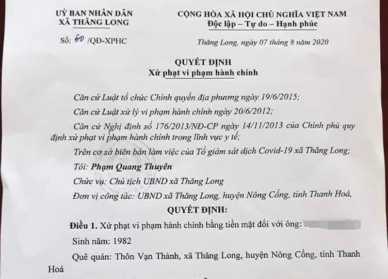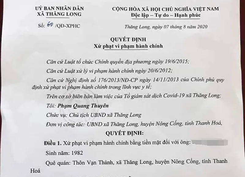 Trưa 8-8, UBND xã Thăng Long, huyện Nông Cống (Thanh Hóa) đã có quyết định xử phạt vi phạm hành chính số tiền 2 triệu đồng đối với anh KXĐ (38 tuổi, quê thôn Vạn Thành, xã Thăng Long, huyện Nông Cống), hộ khẩu thường trú quận Thanh Khê, TP Đà Nẵng.