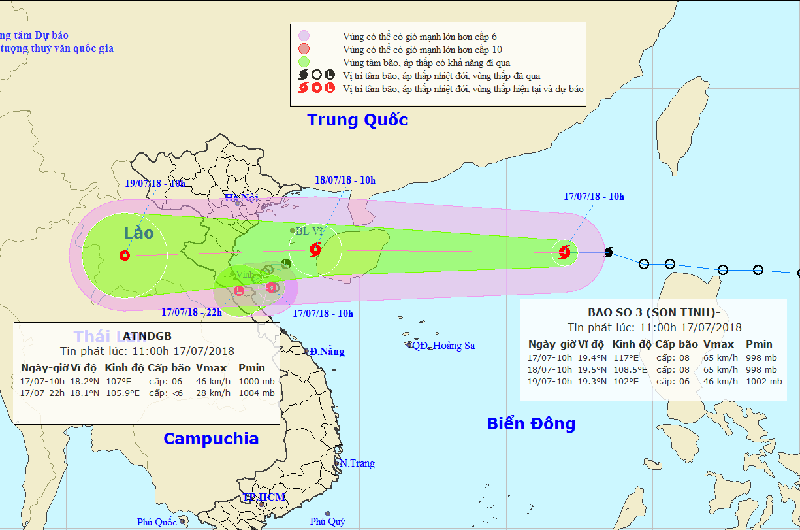 Trong một diễn biến khác, lúc này phía Bắc Biển Đông áp thấp nhiệt đới đã mạnh lên thành cơn bão số 3 trong năm 2018, có tên Quốc tế là Sơn Tinh.