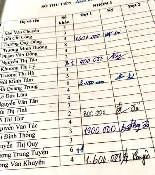Một trang trong sổ thu đợt 1 mỗi người 400.000 đồng của thôn Thung Tâm. Ảnh: ĐẶNG TRUNG