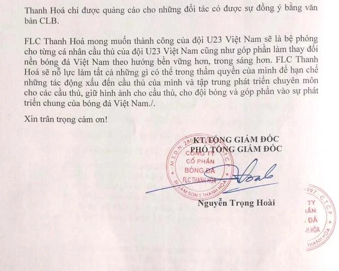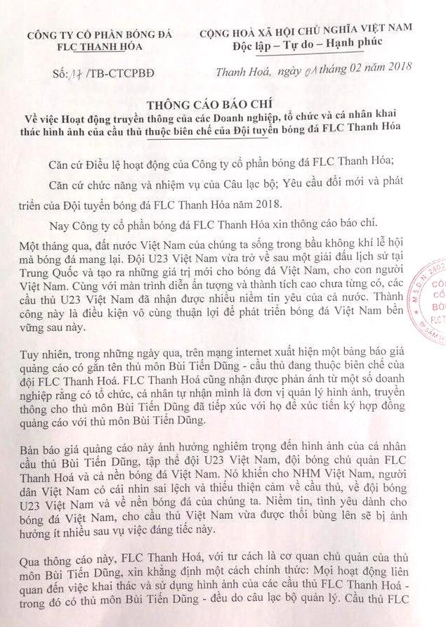 Thông cáo báo chí nêu rõ “…trong những ngày qua trên mạng Internet xuất hiện bảng báo giá quảng cáo có gắn tên thủ môn Bùi Tiến Dũng - cầu thủ thuộc biên chế đội FLC Thanh Hóa… Bảng báo giá này ảnh hưởng nghiêm trọng đến hình ảnh cá nhân thủ môn Bùi Tiến Dũng, tập thể đội U-23 Việt Nam, đội bóng chủ quản FLC Thanh Hóa và cả nền bóng đá Việt Nam. Nó khiến người dân Việt Nam, người hâm mộ Việt Nam có cái nhìn sai lệch và thiếu thiện cảm về cầu thủ, về cầu thủ U-23 Việt Nam và cả nền bóng đá của chúng ta”.