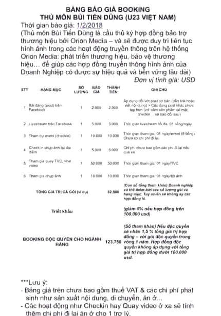 Trước đó vài ngày, mạng xã hội xuất hiện bảng báo giá quảng cáo được cho là hợp đồng bảo trợ thương hiệu giữa thủ môn Bùi Tiến Dũng và Orion Media. Theo đó, mọi status xuất hiện trên trang cá nhân, livestream, tham dự sự kiện, chụp ảnh check-in… của Bùi Tiến Dũng có giá 2.500-50.000 USD/sự kiện.