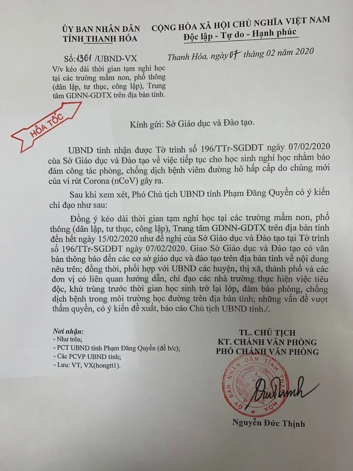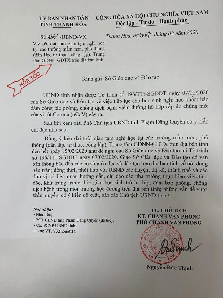 Sau khi xem xét, Phó Chủ tịch tỉnh Thanh Hóa - ông Phạm Đăng Quyền đã có ý kiến và đồng ý kéo dài thời gian tạm nghỉ học tại các trường mầm non, phổ thông (dân lập, tư thục, công lập), trung tâm GDNN-GDTX trên địa bàn tỉnh Thanh Hóa đến hết ngày 15-2.