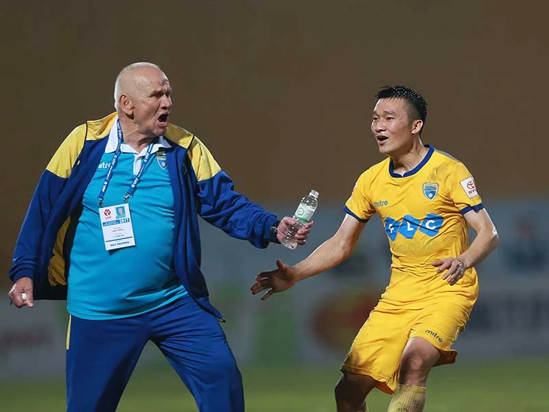 Thầy trò Petrovic vui như Tết sau khi soán ngôi nhất bảng của Hà Nội. Ảnh: QUANG THẮNG